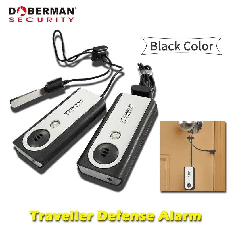 Beste Koop Doberman Security Reiziger Defense Alarm Zwarte Kleur Beveiliging Bescherming Draagbare Deur Alarm met Flitslicht Sensor Detector Goedkoop
