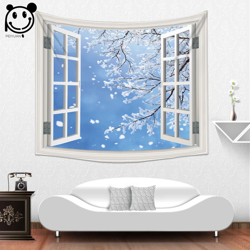 Kopen Goedkoop PEIYUAN Nieuwe Ontwerp Hoge Kwaliteit Gedrukt Nep Venster Mooie Landschap Sneeuw Rime Woods Lake Home Decoratieve Gordijn Wandtapijt Online